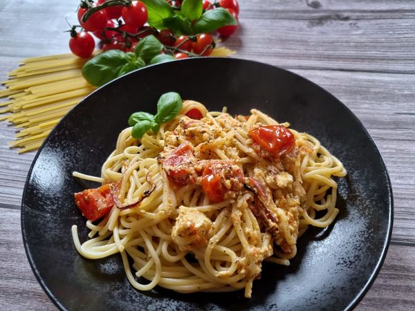 Die Tomaten, Zwiebelringe und den Knoblauch um den Feta verteilen. Toskana, Knobi Genuss Salz und Italienisches Genuss Salz 2 Minuten in dem Wasser quellen lassen und über dem Gemüse und dem Feta verteilen. Alles mit dem Griechischem Olivenöl beträufeln und für 25-30 Minuten bei 180 Grad Ober-/Unterhitze im Backofen garen. In der Zwischenzeit Spaghetti nach Packungsanweisung mit Meersalz zubereiten. Nach der Garzeit den Feta und die Tomaten mit einer Gabel grob zerkleinern und die gekochten Spaghetti unterheben. Mit Basilikum servieren und genießen.